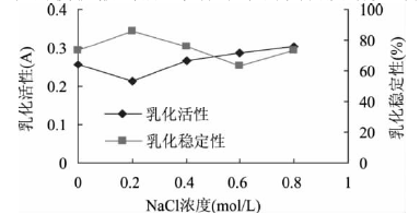 顧楠[9]等人在研究鷹嘴豆分離蛋白乳化性質時,選用不同梯度的離子濃度,分別為0.1、0.2、0.4、0.6、0.8mol/L的NaCl溶液,測定乳化活性和乳化穩定性。結果如下: