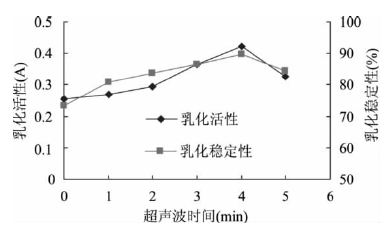 顧楠[9]等人的研究中采用超聲波對鷹嘴豆分離蛋白進行處理,觀察超聲波不同的處理時間對其乳化活性及乳化穩定性質的影響。試驗方法類同微波處理,所選用的超聲波功率密度為0.3W/cm2,處理時間分別為0、1、2、3、4、5min,結果如下: