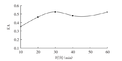鄧塔[5]等人采用不同梯度的加熱時間對大豆蛋白進行處理,在60℃,pH=5的條件下,處理10~60min大豆蛋白溶液,測定其乳化性。結果如圖: