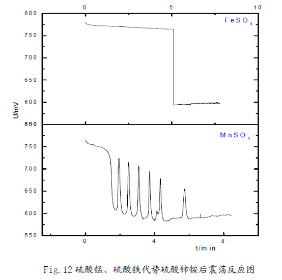 3) 用硫酸錳代替硫酸鈰銨后,可以看到振蕩現象,但是用硫酸鐵代替硫酸鈰銨,振蕩反應沒有發生,但是查閱資料知:Mn2+、Fe3+同樣具有催化作用。在振蕩體系中,錳元素存在Mn2+、Mn3+兩種形式,鐵元素以Fe2+、Fe3+的形式存在。