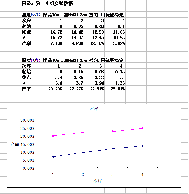 2、 第二組反應溫度比**組高5度,但是產(chǎn)率卻大大高于**組,我們分析出現(xiàn)這種現(xiàn)象的原因可能是溫度升高在較短的反應時間內(nèi)對反應速率影響較大。