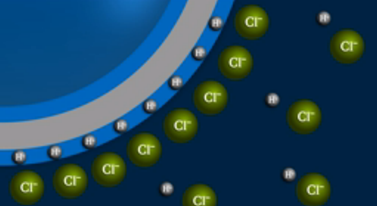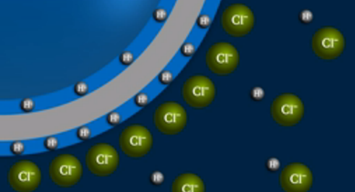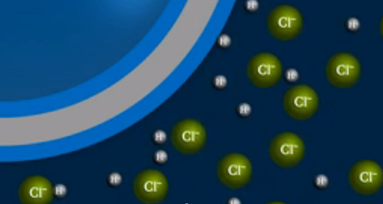當探針浸入溶液中時,較小的氫離子能夠穿透玻璃膜的邊界區域,較大的氯離子保留在溶液本身中。因此,結果是電荷分離,如下圖所示: